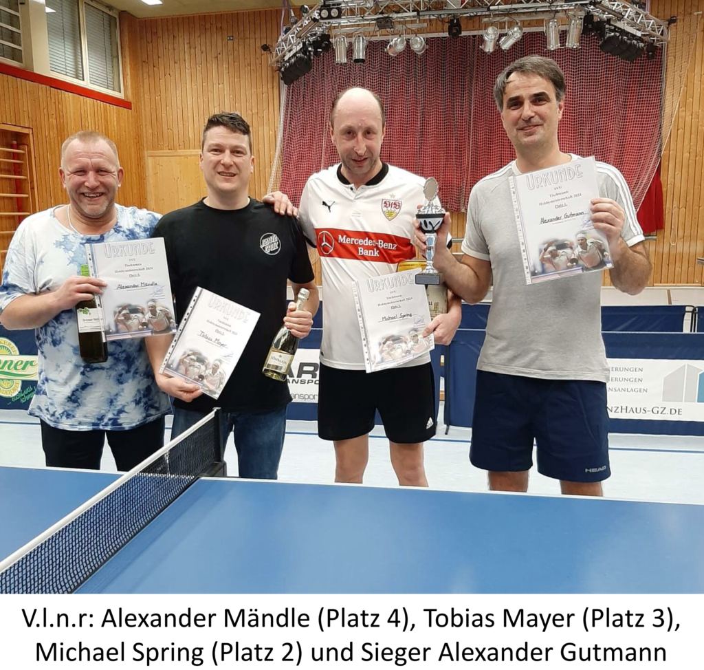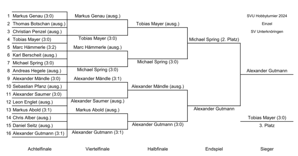 Nach kurzem Umbau der Halle – die Finalspiele wurden nun auf einem großen Center Court ausgetragen – wurde zunächst das kleine Finale ausgetragen. Tobias Mayer konnte zu alter Stärke zurückfinden und sicherte sich mit einem klaren 3:0-Erfolg über Alexander Mändle den 3. Platz. Anschließend kam es im Finale zu einer Neuauflage des Gruppenspiels in Gruppe B, da sich dort Alexander Gutmann und Michael Spring schon einmal duellierten. Wie bereits am frühen Abend (knapper 3:2 Gruppenspiel-Sieg für Alexander Gutmann) kam es auch zu später Stunde, kurz nach 24 Uhr, zu einem nervenaufreibenden Krimi. Am Ende hatte Alexander Gutmann trotz insgesamt weniger erzielter Punkte (er gewann alle Sätze mit nur 2 Punkten Unterschied, verlor einen vierten Satz jedoch mit 1:11 Punkten) die entscheidenden Momente auf seiner Seite und krönte sich zum Unterknöringer Hobbyspieler 2024.