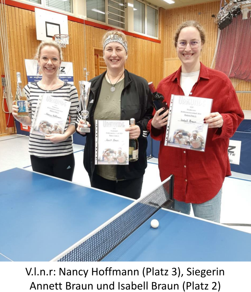 Nachdem im vorhergehenden Jahr die Resonanz auf die Erstauflage des Hobbyturniers durchweg positiv ausfiel, wurde am Abend des 05.01.2024 in der Unterknöringer Schulturnhalle das zweite Turnier für Hobbyspieler ausgerichtet. Neben bekannten Gesichtern vom vorhergehenden Jahr konnte Abteilungsleiter Benjamin Findler auch einige neue Tischtennisbegeisterte ab 19:00 Uhr herzlich willkommen heißen. Die Gesamtteilnehmerzahl stieg im Vergleich zum Vorjahr um 50%, sodass am Ende 3 Frauen und 35 Männer um den Titel des Hobbymeisters 2024 kämpften. Die 3 Damen spielten dabei nicht nur die Siegerin in der Damen-Konkurrenz im Modus „jede gegen jede“ unter sich aus, sondern starteten auch in der Herren-Konkurrenz, die im Modus Gruppenphase mit anschließendem KO-System ausgetragen wurde. Bei den Damen konnte sich Annett Braun ganz deutlich mit zwei 3:0-Siegen gegen Isabell Braun (Platz 2) sowie Nancy Hoffmann (Platz 3) durchsetzen.